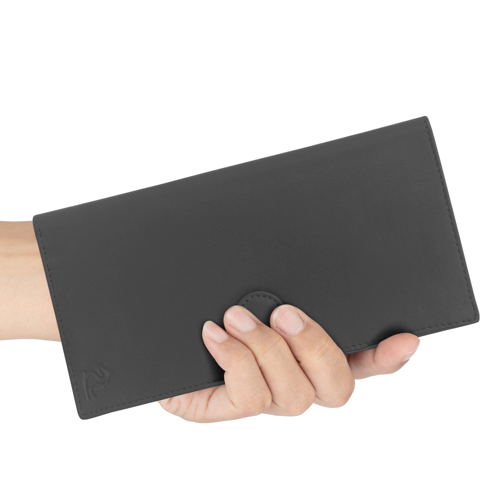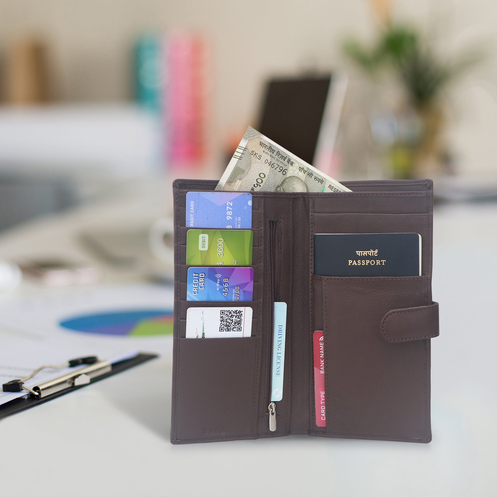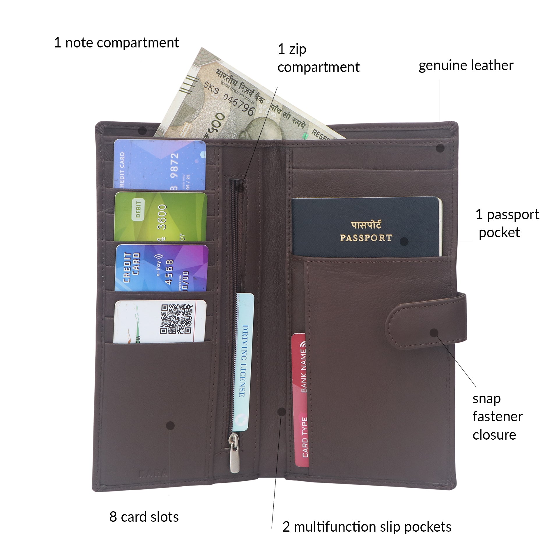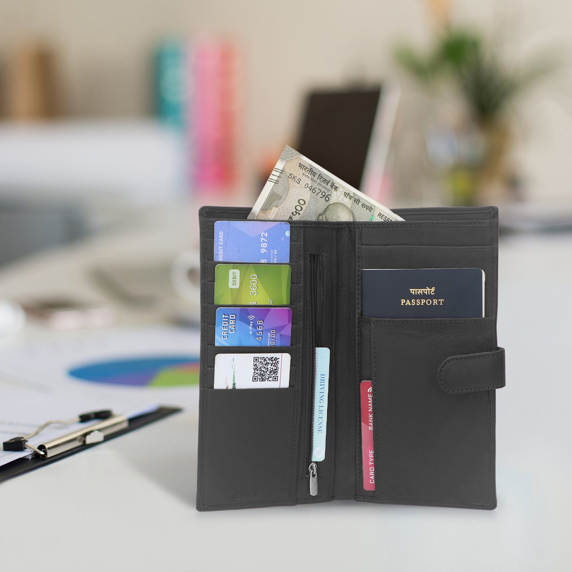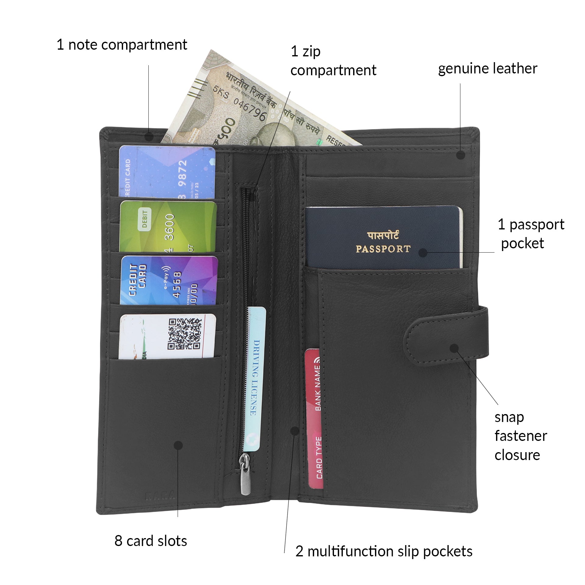 Upgrade your travel essentials with the KARA Black Passport Holder, crafted for luxury, durability, and seamless organization. Made from premium genuine leather, this sleek and stylish travel wallet keeps your passport, tickets, cash, and cards secure and easily accessible. With 8 card slots, a zip compartment, and multiple slip pockets, it ensures effortless organization without bulk. Perfect for frequent travelers, this lightweight yet spacious passport holder comes in an elegant gift box, making it an ideal gift for travel enthusiasts.