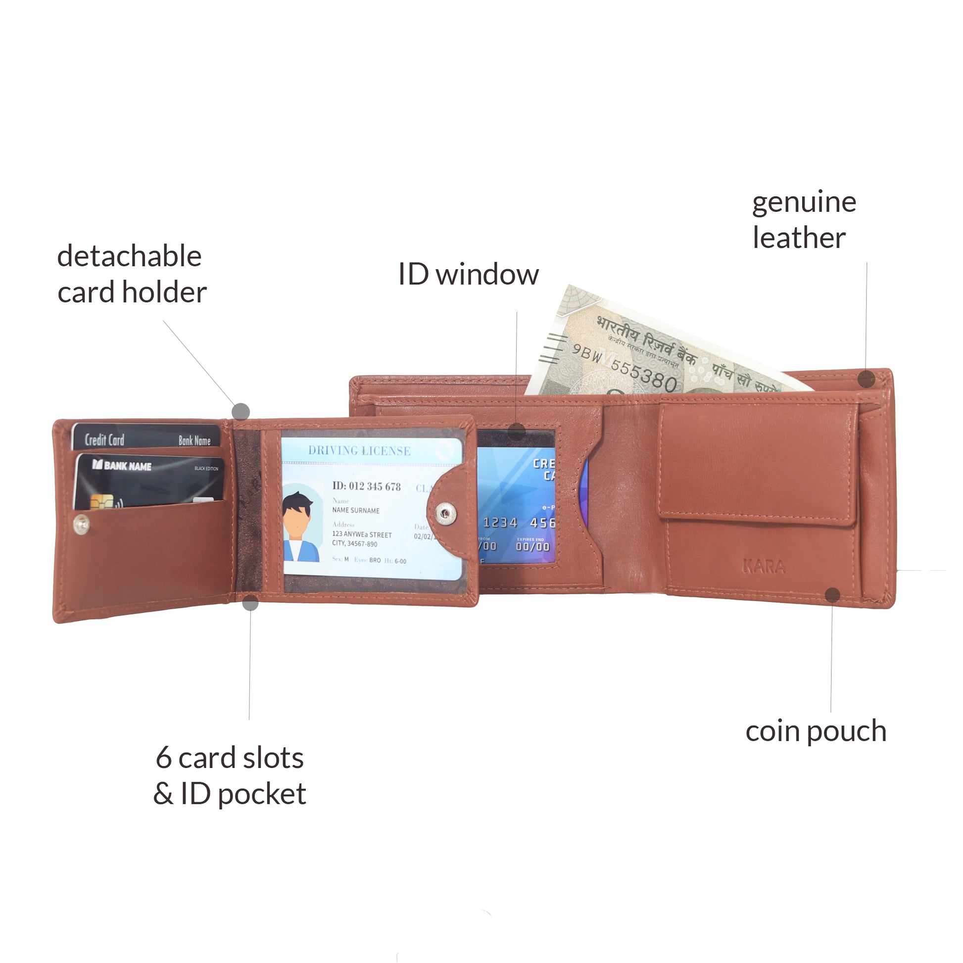Designed for elegance and practicality, the KARA Cognac Bifold Wallet is a refined essential for those who appreciate premium craftsmanship and everyday functionality. Handcrafted from genuine vegetable-tanned leather, it features a richly textured finish that exudes timeless sophistication. Designed to maximize storage without bulk, it includes 6 card slots, 2 bill compartments, 2 slip pockets, and an ID slot, offering effortless organization. A secure coin pocket keeps your change in place, while the detachable cardholder provides extra flexibility when you need to travel light. With its sleek design and durable build, this wallet is a perfect blend of luxury and utility, making it an ideal companion for the modern man.