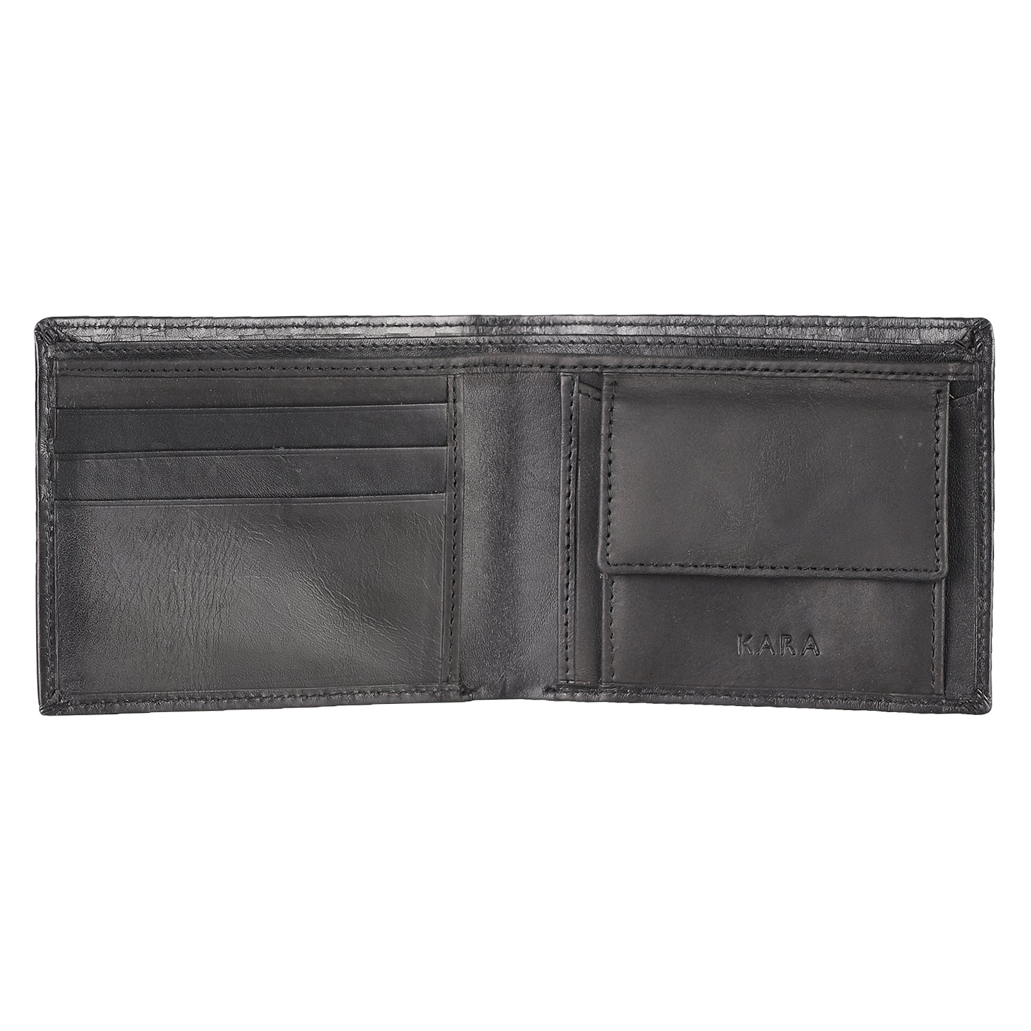 Elevate your accessory game with the KARA Black Textured Bifold Wallet, where timeless craftsmanship meets modern design. Handcrafted from premium genuine leather, this wallet features an embossed print that adds a contemporary touch to its classic bifold structure. With ample space for cards, cash, and coins, this sleek wallet combines functionality with style, making it the perfect everyday accessory.