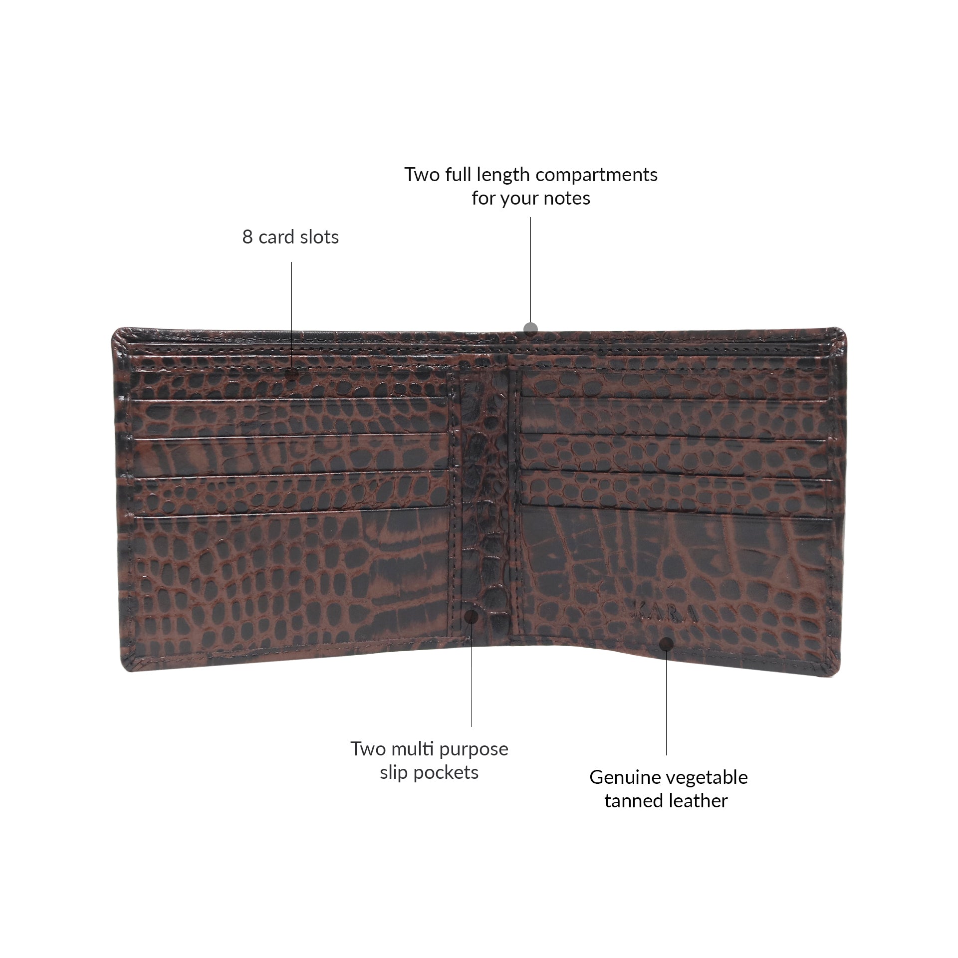 KARA uses premium full-grain, top-grain, and vegetable-tanned genuine leather. Each leather type is ethically sourced and selected for its exceptional durability, rich texture, and timeless elegance in wallets, belts, and bags.