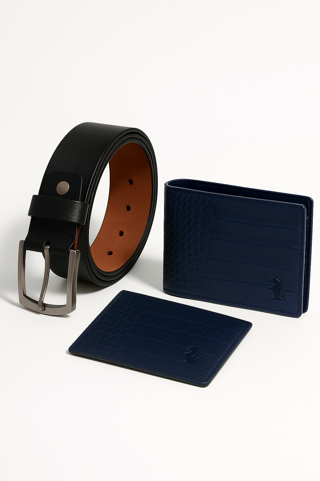 Style-First Leather Gift Set – Designer Belt, Croco Wallet & Card Holder Combo