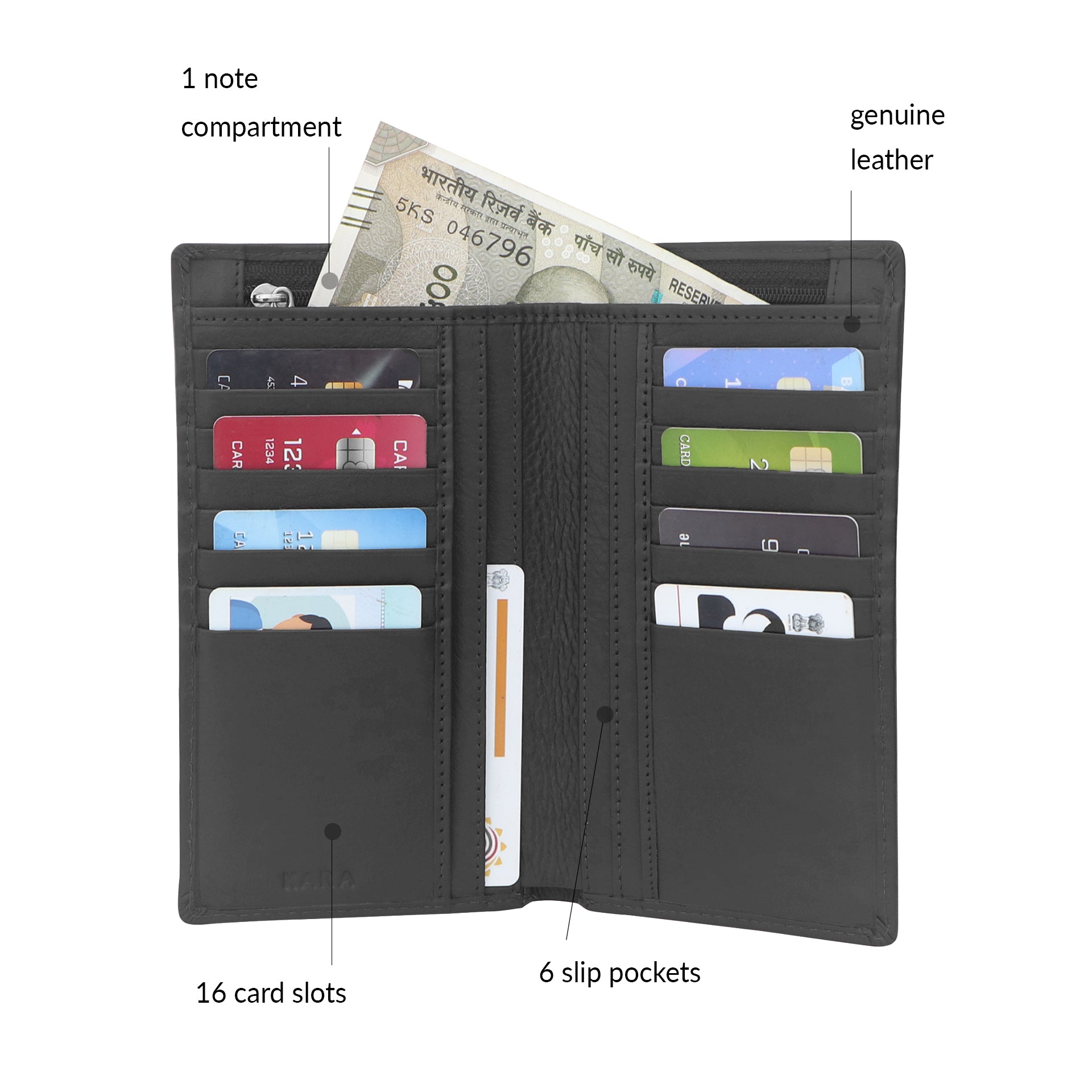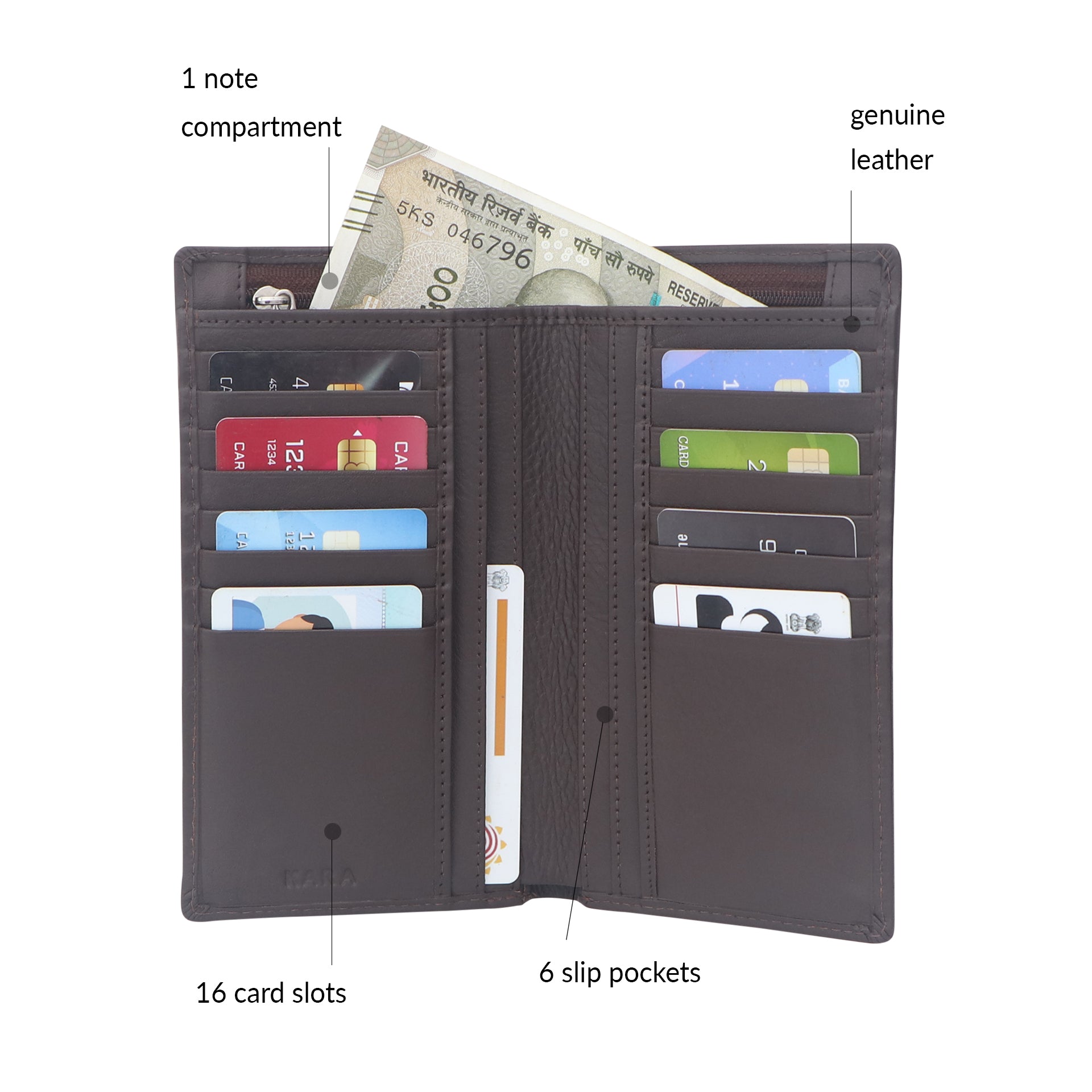 - Spacious Design: Includes 16 credit card slots, 6 slip pockets, and 1 bill compartment with a large zipped pocket for added security.